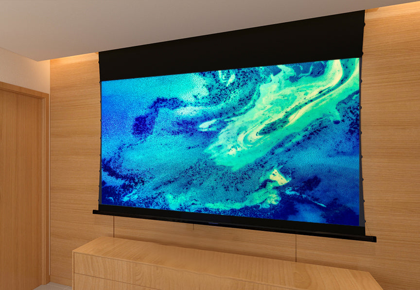 TJ Series — Motorized Tab-Tensioned Woven Acoustically Transparent Screen (4K Ready)